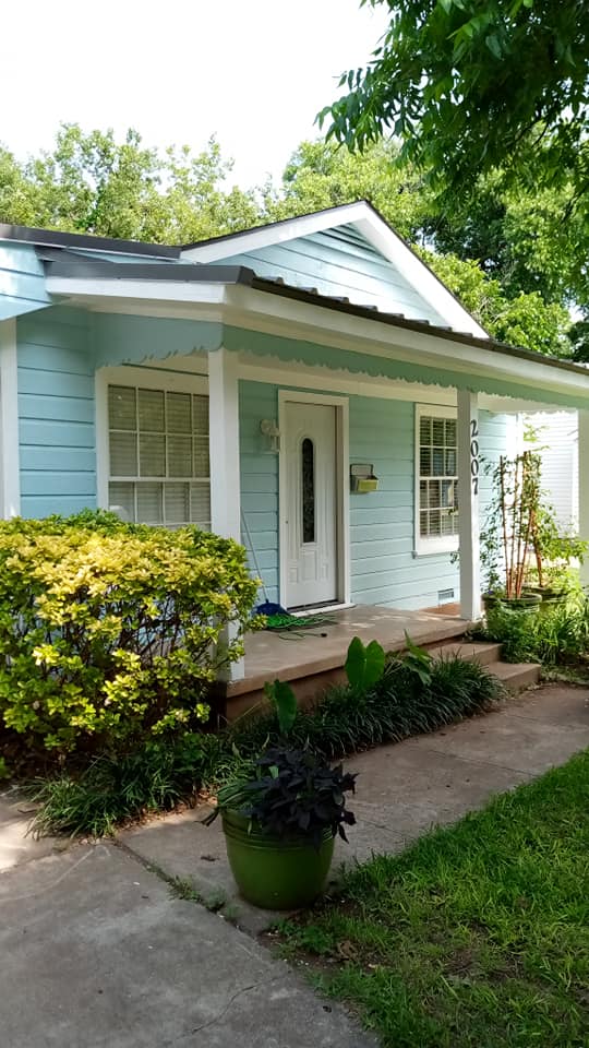 This home went from severely weathered and peeling wood siding to a stunning aqua blue cottage with crisp white trim and black shutters. One of our most dramatic transformations.