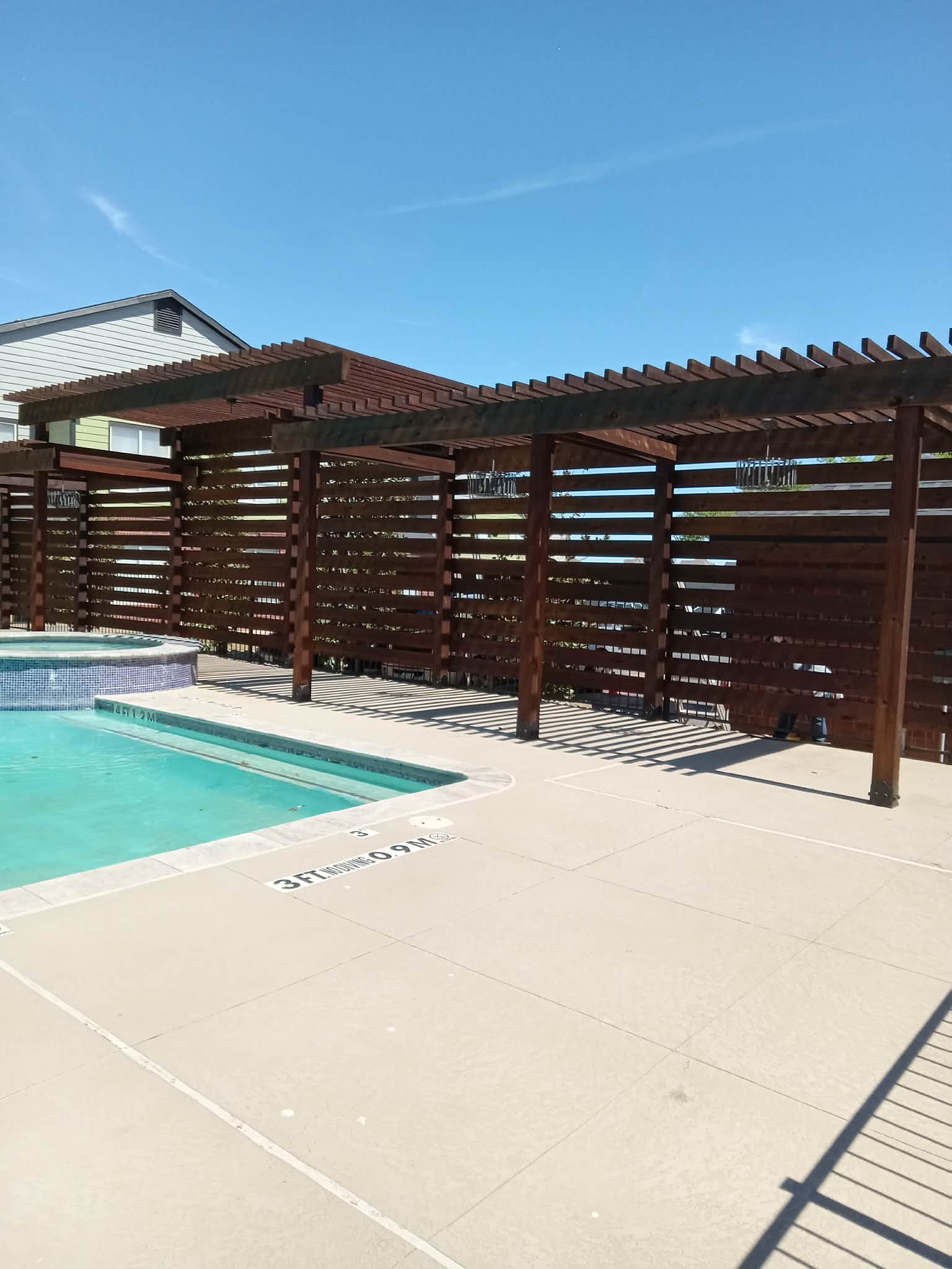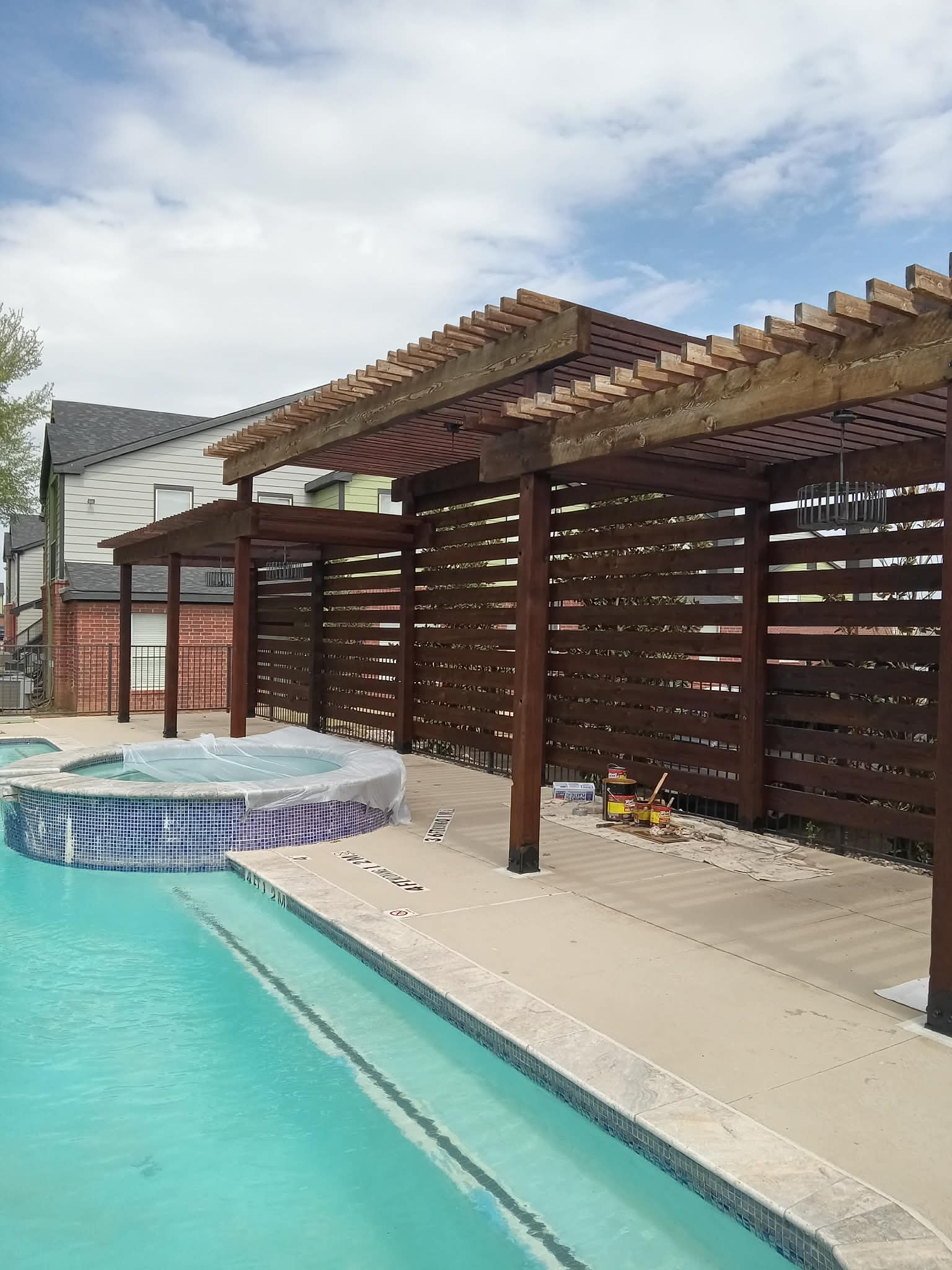 Complete pergola and privacy screen staining at an apartment pool area. Rich dark brown stain applied with professional techniques for long-lasting protection.