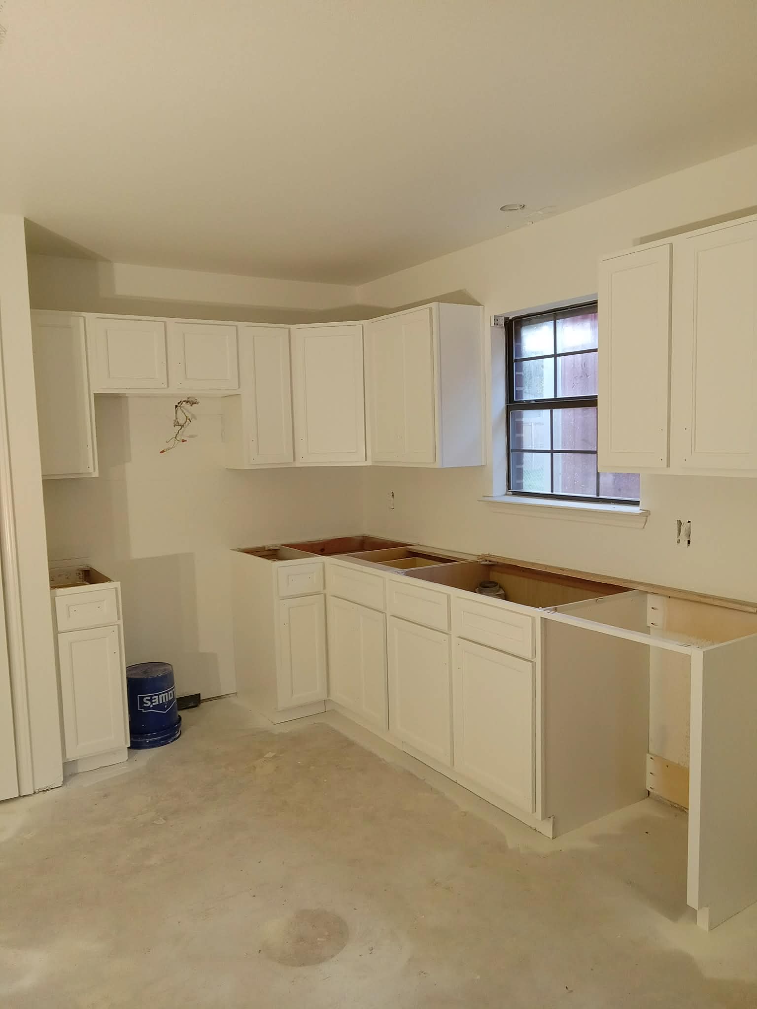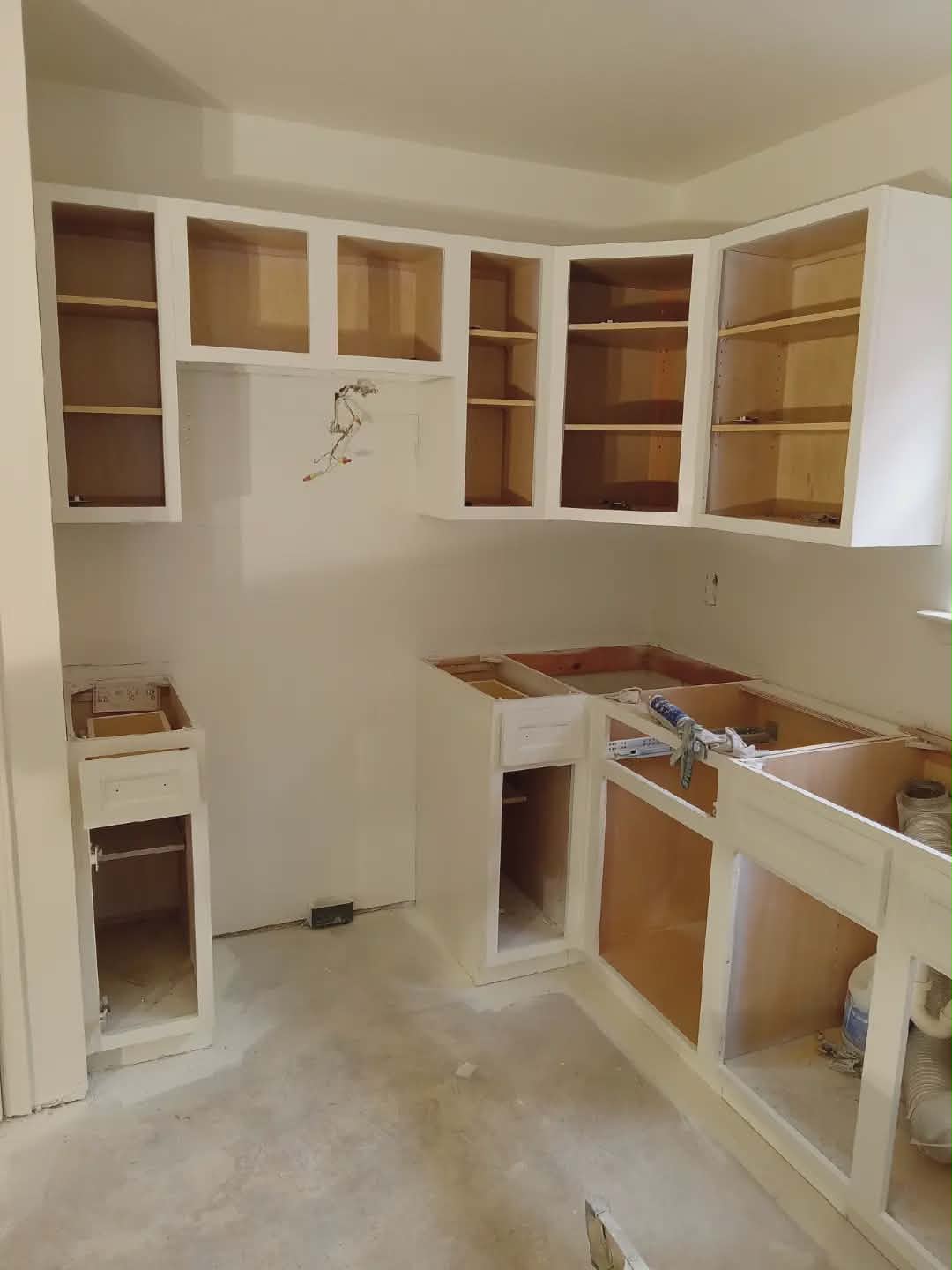 Complete kitchen cabinet transformation. Cabinet frames primed and painted white for a bright, modern look that completely refreshes the space.